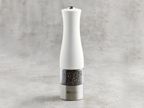 Bring some flavour to the table with the Cosmopolitan electric mill in white. Ergonomically designed with a curved cylinder and a simple push-button mechanism, it’s a stylish addition to any setting. With a generous 60mL capacity and a powerful ceramic grinding mechanism, it gives you perfectly milled seasonings every time. It’s equally suitable for salt or pepper, so you can choose a matching pair or contrast with another colour from the Cosmopolitan electric mill range.