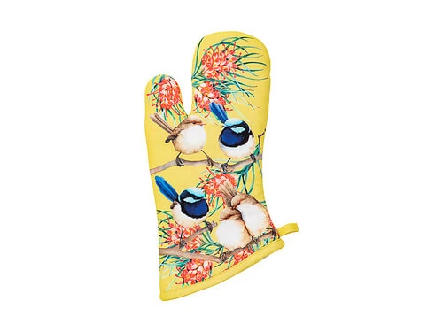 This Superb Fairy Wrens oven mitt from the Bird Talk collection celebrates the beauty of our iconic native birds. Created in collaboration with artist Katherine Castle, it features an original design with her signature rich colours and fine details. The beautiful oven mitt is the stylish way to handle hot dishes in the kitchen, made from thick cotton with an insulated synthetic lining.