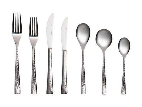 This 42-piece cutlery set from the Wayland collection is a welcome addition to any table setting. With stylish shapes and a hammered metal design on handles each piece in the set gives off a slight reflection of light and a lovely tactility in hand. The set includes cutlery for a formal table setting for six people.